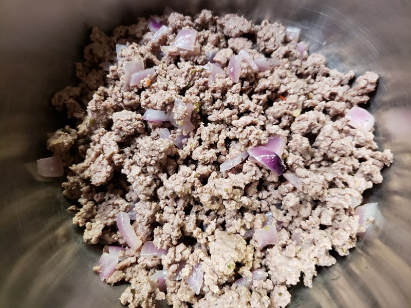 - In a large skillet, brown the beef (adding in seasoning, garlic, and onions while cooking) on the stovetop and drain. Place in a bowl, add low carb marinara to beef and stir.